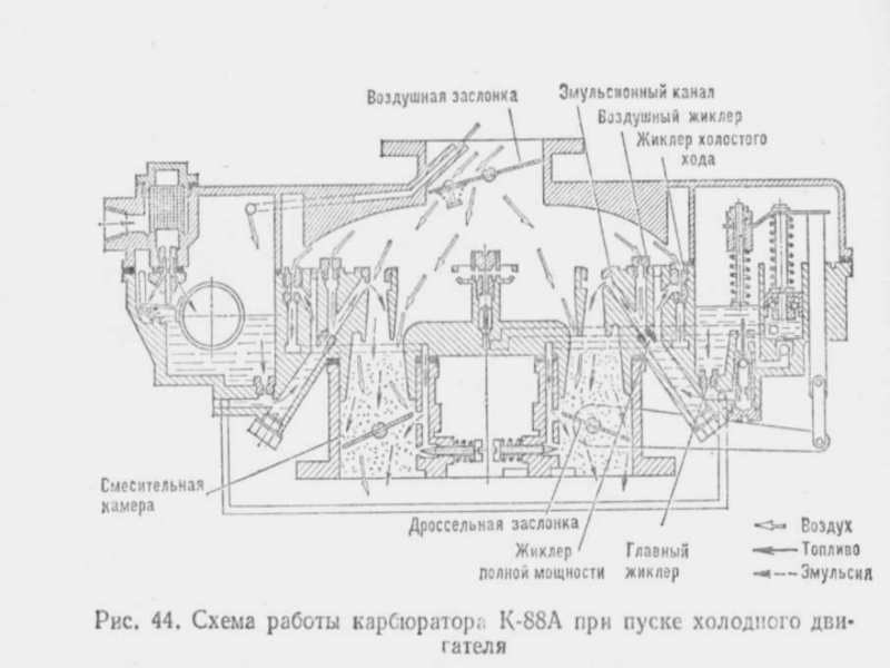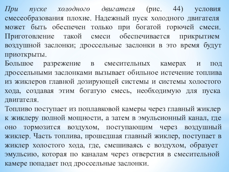 Слайд 43При пуске холодного двигателя (рис. 44) условия смесеобразования плохие. Надежный пуск
