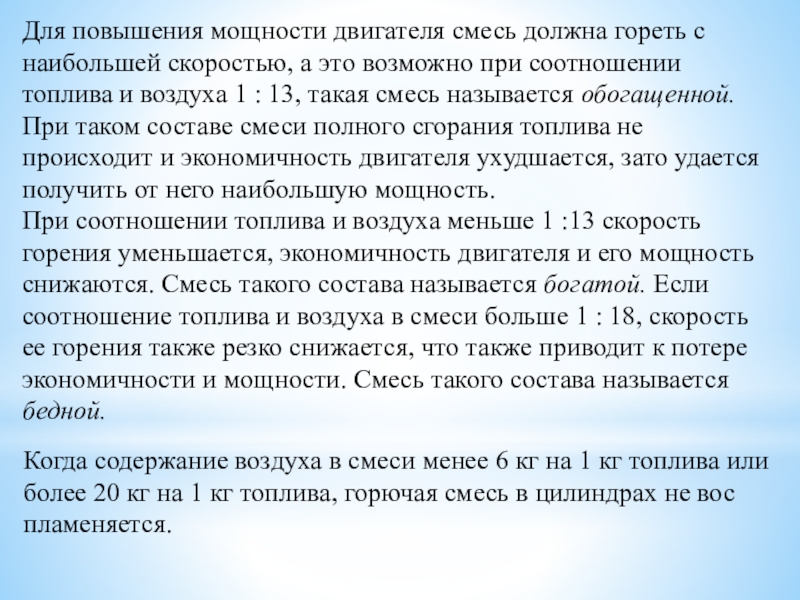это возможно при соотношении топлива и воздуха 1 : 13, такая смесь называется обогащенной. При таком составе смеси полного сгорания топлива не происходит и экономичность двигателя ухудшается, зато удается получить от него наибольшую мощность.