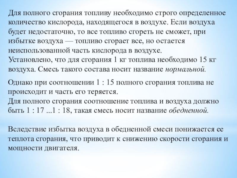 Слайд 10Для полного сгорания топливу необходимо строго определенное количество кислорода, находящегося в