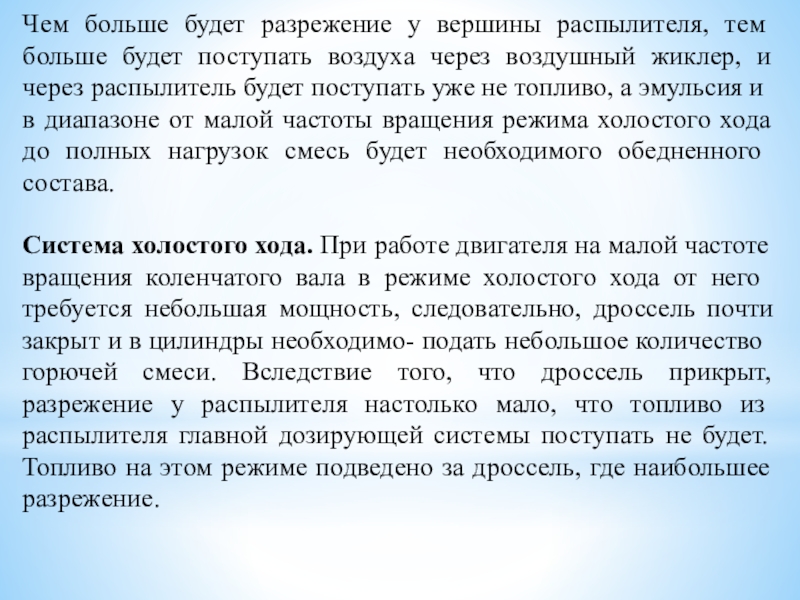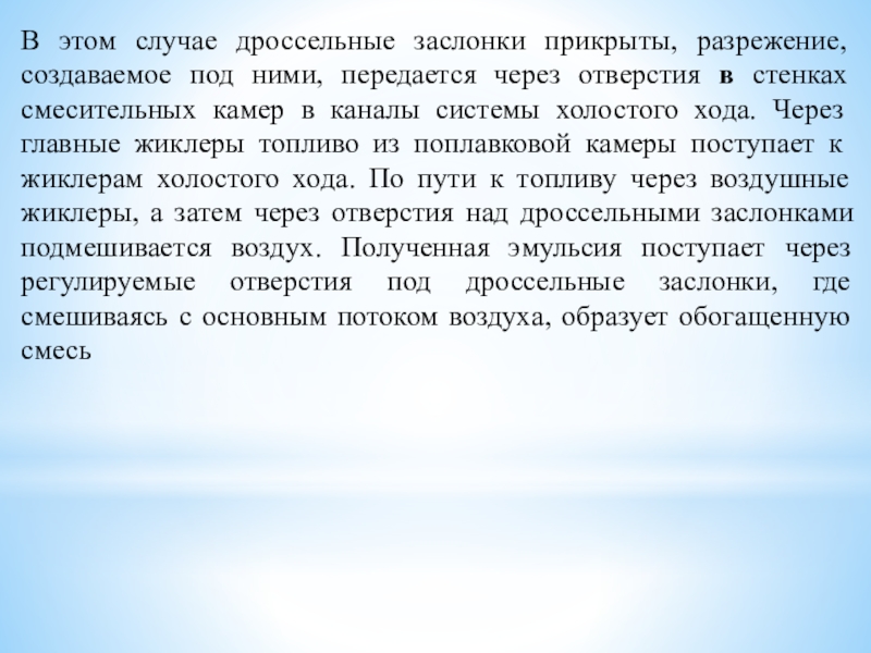 Слайд 40В этом случае дроссельные заслонки прикрыты, разрежение, создаваемое под ними, передается