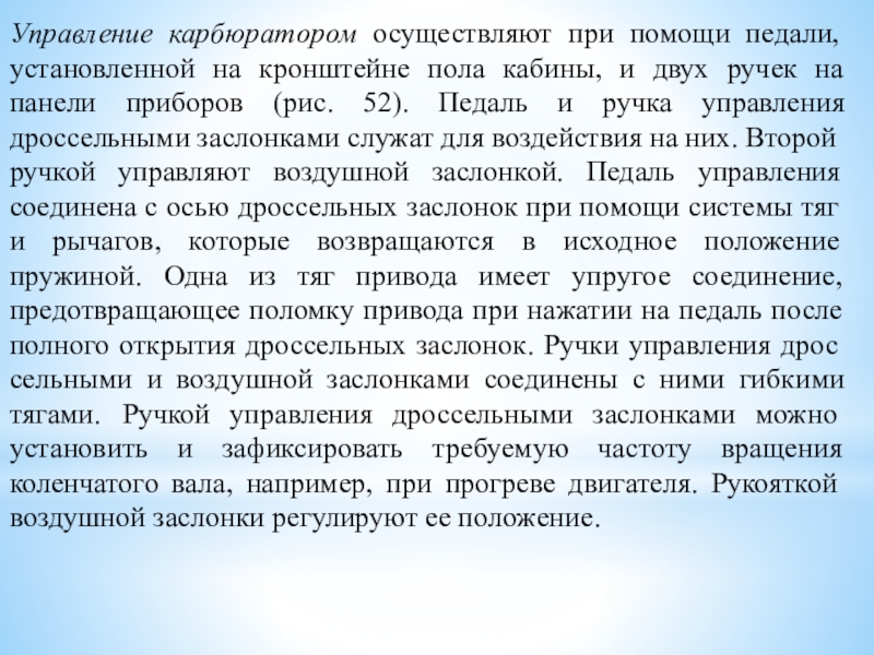 Слайд 58Управление карбюратором осуществляют при помощи педали, установленной на кронштейне пола кабины,