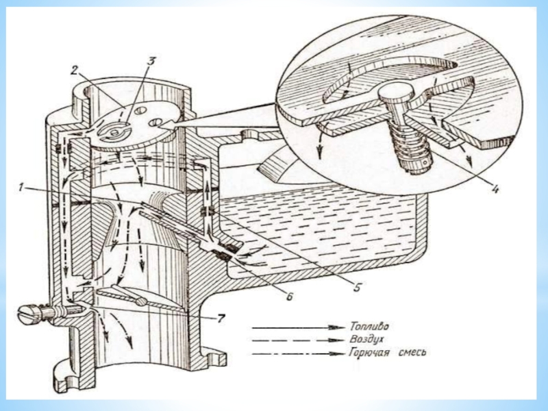 При заполнении поплавковой камеры уровень топлива повышается, поплавок, всплывая, давит на клапан и закрывает отверстие в седле .Если топливо не расходуется, то подача его в поплавковую камеру прекращается и уровень топлива остается постоянным. Выходное отверстие распылителя расположено несколько выше уровня топлива в поплавковой камере (1—2 мм).