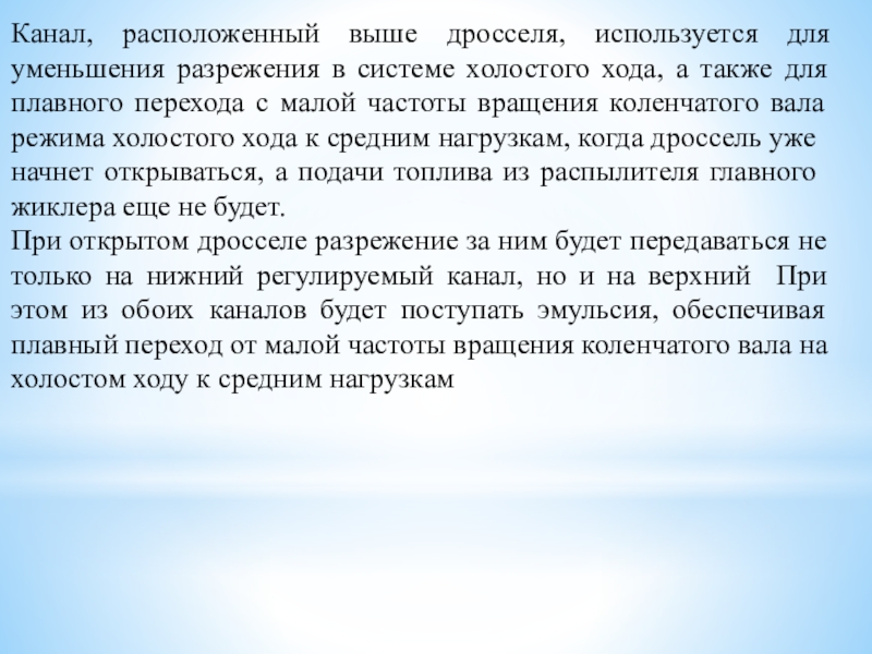 Слайд 25Канал, расположенный выше дросселя, используется для уменьшения разрежения в системе холостого