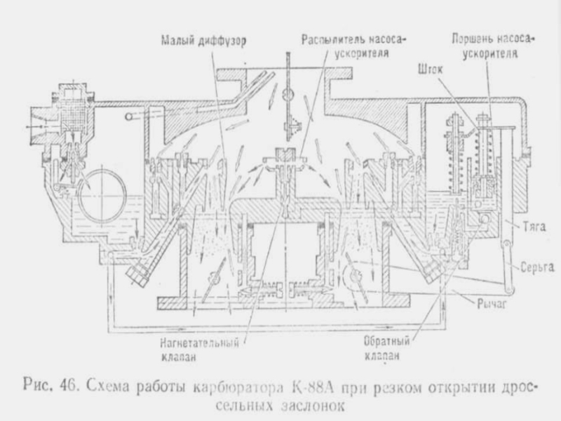 помощи насоса-ускорителя, привод которого связан с рычагом заслонок, серьгой и тягой. Резкое перемещение штока и поршня вниз создает напор топлива, поэтому обратный шариковый клапан закрывается и топливо по каналу поступает к распылителю насоса-ускорителя, открывая нагнетательный клапан. Струя впрыснутого топлива ударяется о стенки малых диффузоров, разбивается на мельчайшие частицы, обогащая смесь для обеспечения приемистости двигателя.
