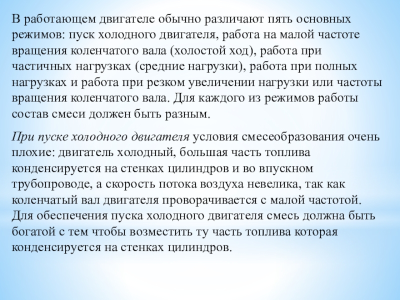 Слайд 12В работающем двигателе обычно различают пять основных режимов: пуск холодного двигателя,