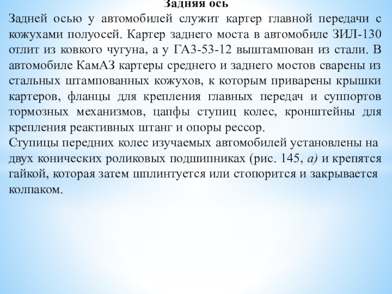 полуосей. Картер заднего моста в автомобиле ЗИЛ-130 отлит из ковкого чугуна, а у ГA3-53-12 выштампован из стали. В автомобиле КамАЗ картеры среднего и заднего мостов сварены из стальных штампованных кожухов, к которым приварены крышки картеров, фланцы для крепления главных передач и суппортов тормозных механизмов, цапфы ступиц колес, кронштейны для крепления реактивных штанг и опоры рессор.