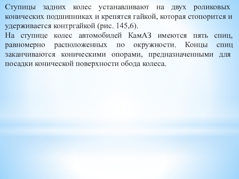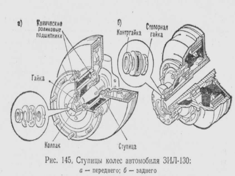 Ступицы передних колес изучаемых автомобилей установлены на двух конических роликовых подшипниках (рис. 145, а) и крепятся гайкой, которая затем шплинтуется или стопорится и закрывается колпаком.