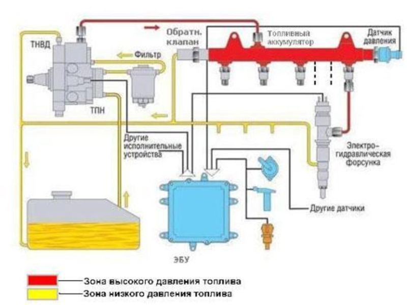 Принцип работы основан на подаче топлива к форсункам от общего аккумулятора высокого давления – топливной рампы. Давление в топливной системе создается и поддерживается независимо ни от частоты вращения коленчатого вала двигателя, ни от количества впрыскиваемого топлива. Сами форсунки впрыскивают топливо по команде контроллера блока EDC, посредством встроенных в них магнитных соленоидов, активация которых, происходит с блока управления.