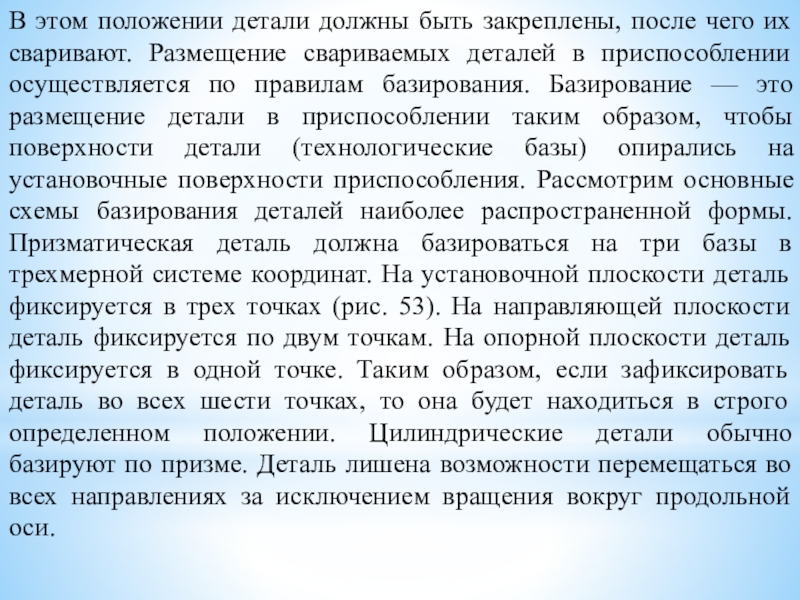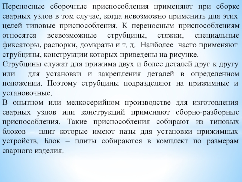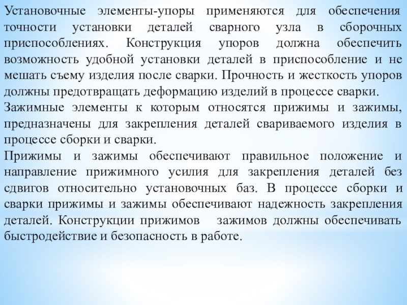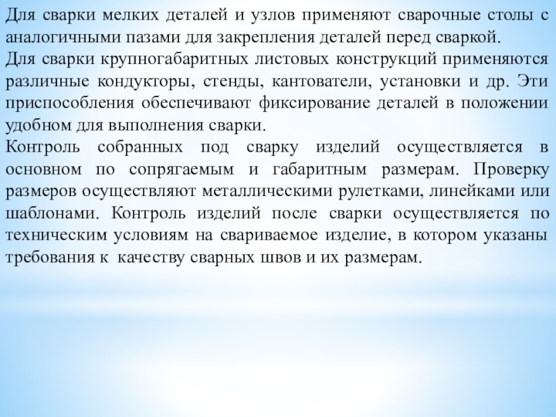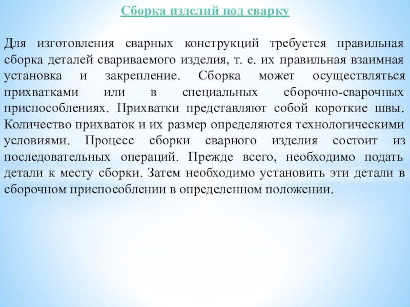 свариваемого изделия, т. е. их правильная взаимная установка и закрепление. Сборка может осуществляться прихватками или в специальных сборочно-сварочных приспособлениях. Прихватки представляют собой короткие швы. Количество прихваток и их размер определяются технологическими условиями. Процесс сборки сварного изделия состоит из последовательных операций. Прежде всего, необходимо подать детали к месту сборки. Затем необходимо установить эти детали в сборочном приспособлении в определенном положении.