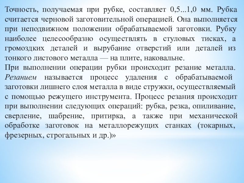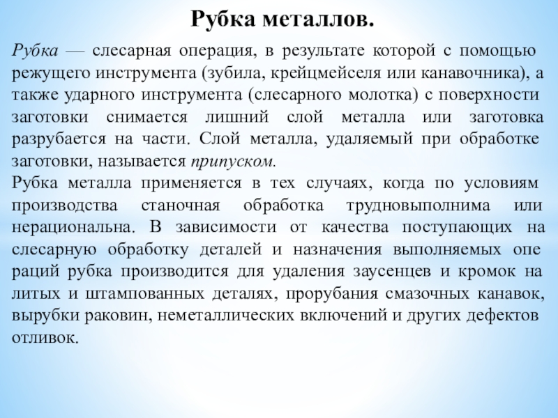 инструмента (зубила, крейцмейселя или канавочника), а также ударного инструмента (слесарного молотка) с поверхности заготовки снимается лишний слой металла или заготовка разрубается на части. Слой металла, удаляемый при обработке заготовки, называется припуском.