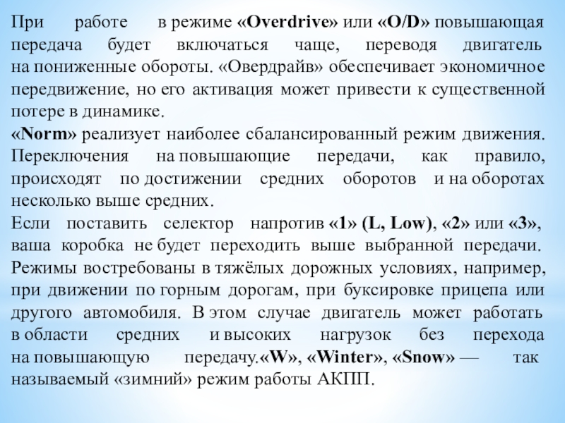 Слайд 45При работе в режиме «Overdrive» или «O/D» повышающая передача будет включаться чаще, переводя двигатель на пониженные обороты.