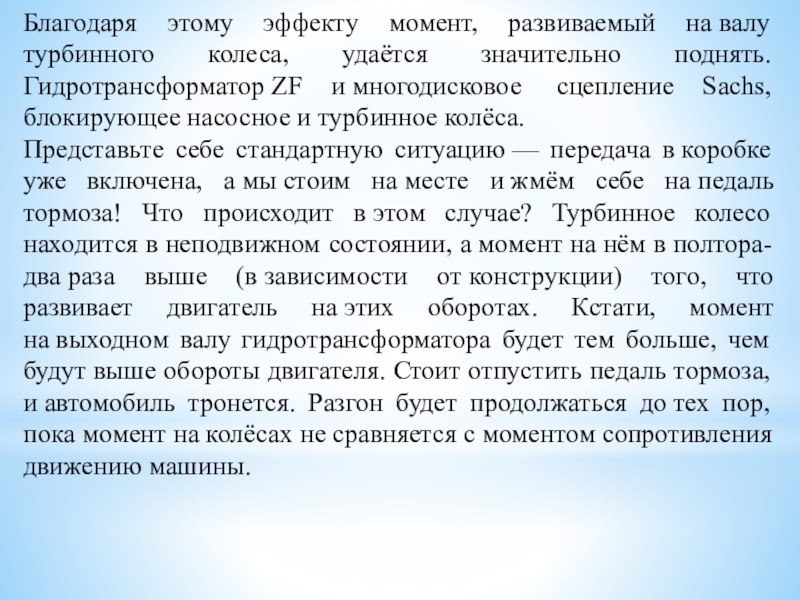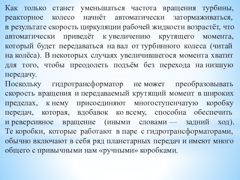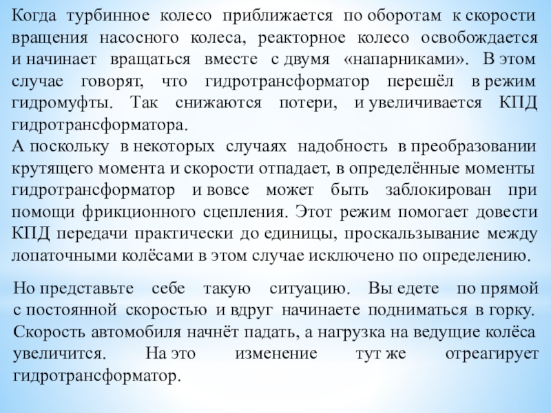 затормаживаться, в результате скорость циркуляции рабочей жидкости возрастёт, что автоматически приведёт к увеличению крутящего момента, который будет передаваться на вал от турбинного колеса (читай на колёса). В некоторых случаях увеличившегося момента хватит для того, чтобы преодолеть подъём без перехода на низшую передачу.