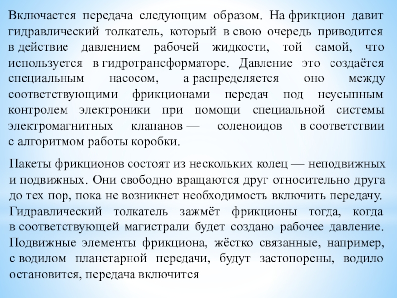 Слайд 26Включается передача следующим образом. На фрикцион давит гидравлический толкатель, который в свою очередь