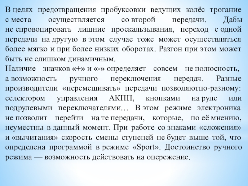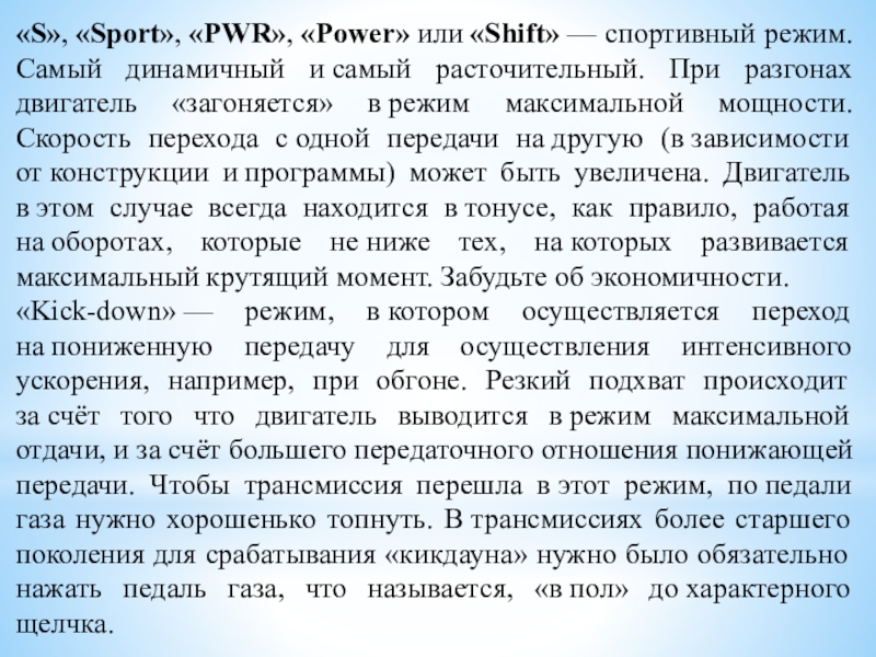 Слайд 44«S», «Sport», «PWR», «Power» или «Shift» — спортивный режим. Самый динамичный и самый расточительный. При разгонах двигатель «загоняется»