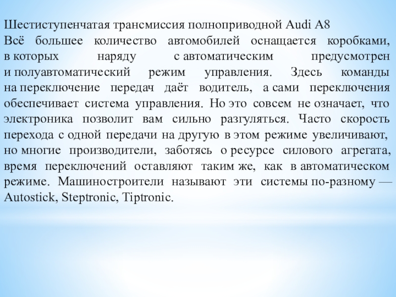 Слайд 36Шестиступенчатая трансмиссия полноприводной Audi A8