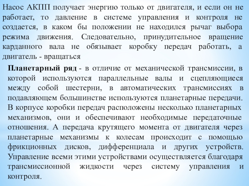 Слайд 7Насос АКПП получает энергию только от двигателя, и если он не