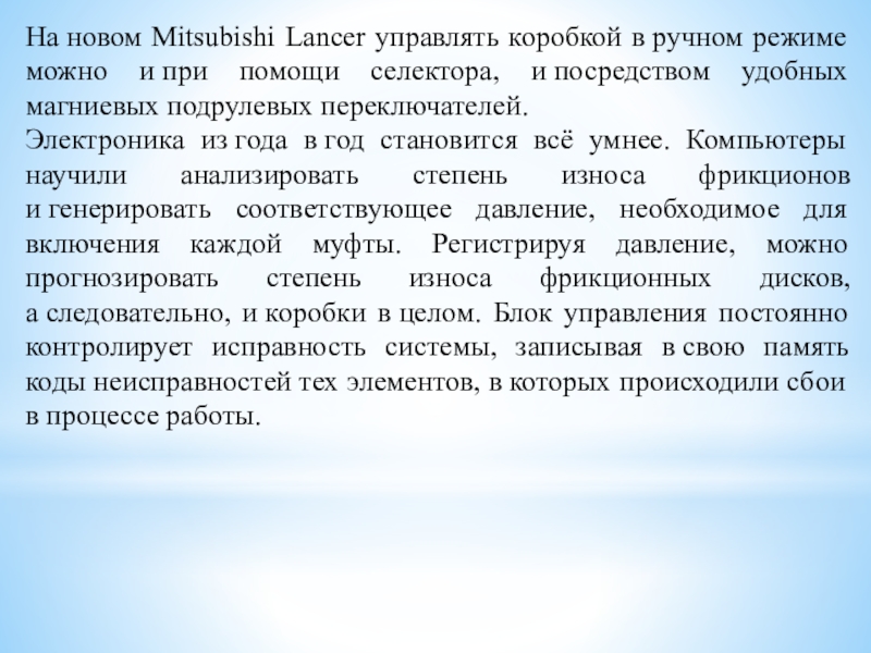 Слайд 40На новом Mitsubishi Lancer управлять коробкой в ручном режиме можно и при помощи селектора,