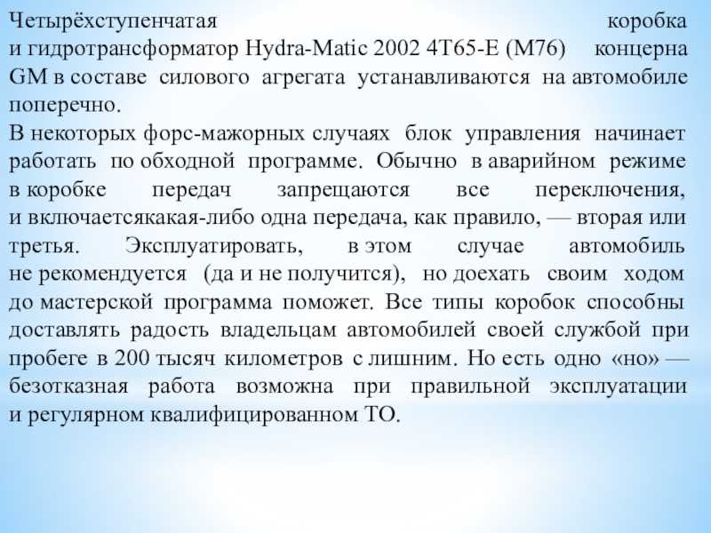 Слайд 42Четырёхступенчатая коробка и гидротрансформатор Hydra-Matic 2002 4T65-E (M76) концерна GM в составе силового агрегата устанавливаются на автомобиле поперечно.