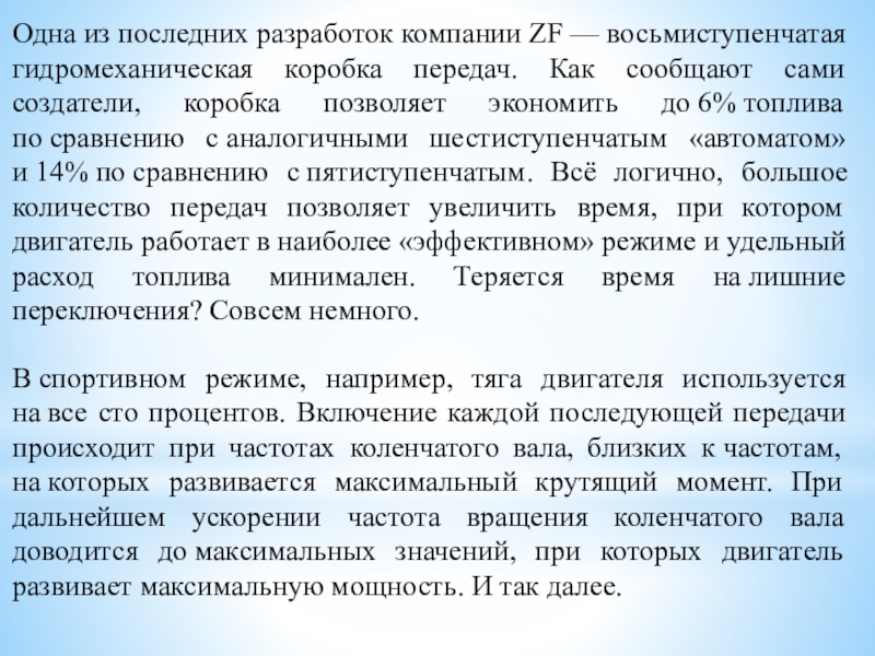 Слайд 32Одна из последних разработок компании ZF — восьмиступенчатая гидромеханическая коробка передач. Как сообщают сами