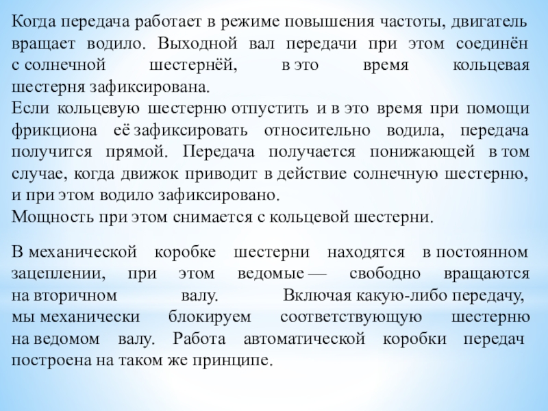 передачи при этом соединён с солнечной шестернёй, в это время кольцевая шестерня зафиксирована.