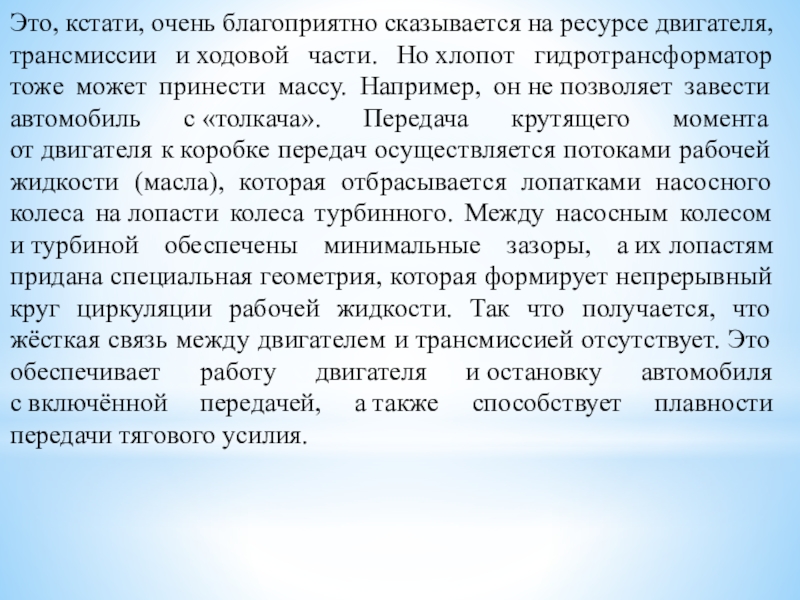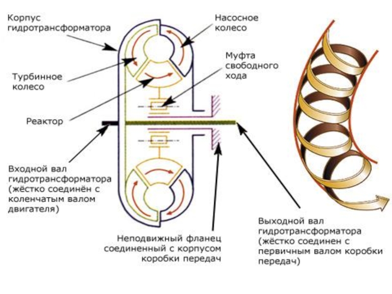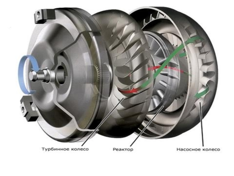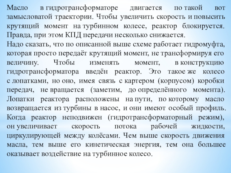 Слайд 15Масло в гидротрансформаторе двигается по такой вот замысловатой траектории. Чтобы увеличить скорость и повысить