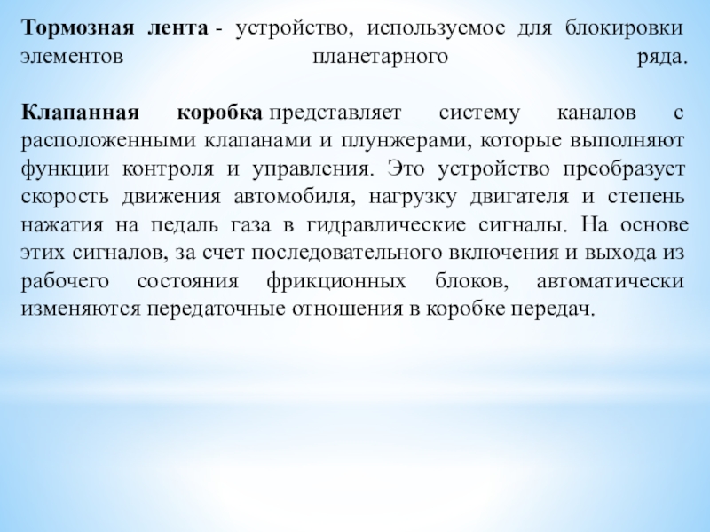 Слайд 8Тормозная лента - устройство, используемое для блокировки элементов планетарного ряда.