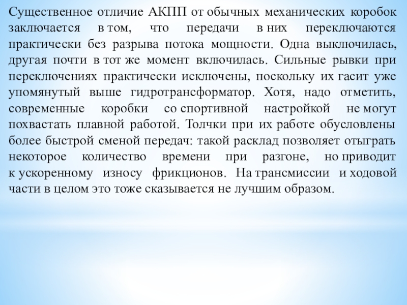 Слайд 28Существенное отличие АКПП от обычных механических коробок заключается в том, что передачи в них