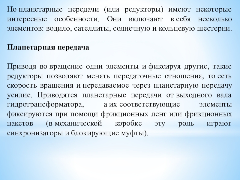 Слайд 24Но планетарные передачи (или редукторы) имеют некоторые интересные особенности. Они включают в себя