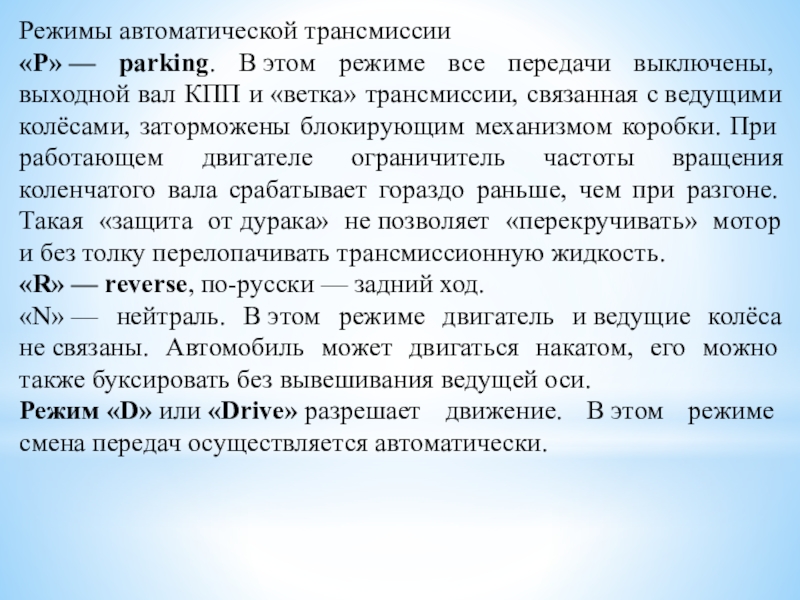 «P» — parking. В этом режиме все передачи выключены, выходной вал
