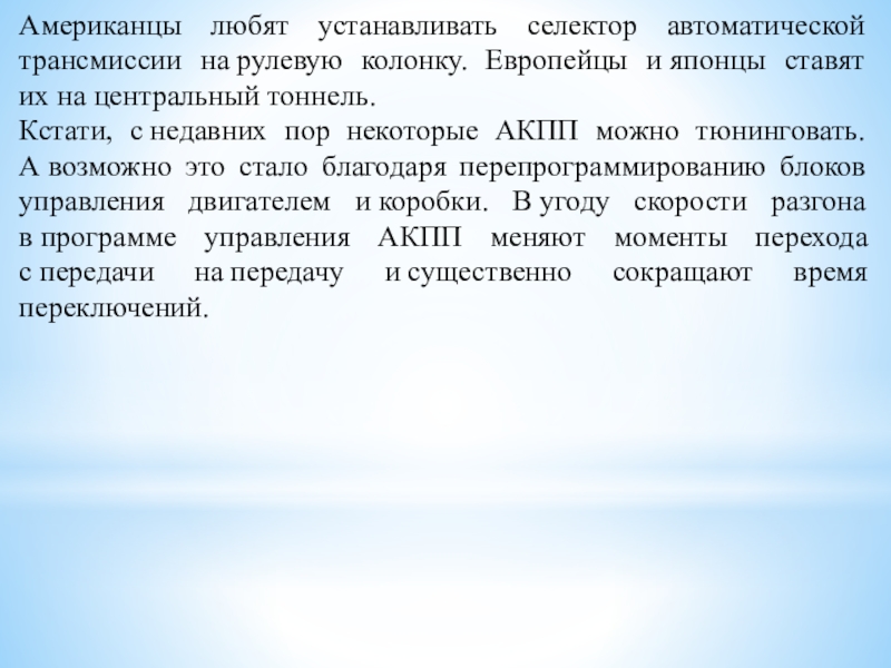 Слайд 38Американцы любят устанавливать селектор автоматической трансмиссии на рулевую колонку. Европейцы и японцы ставят