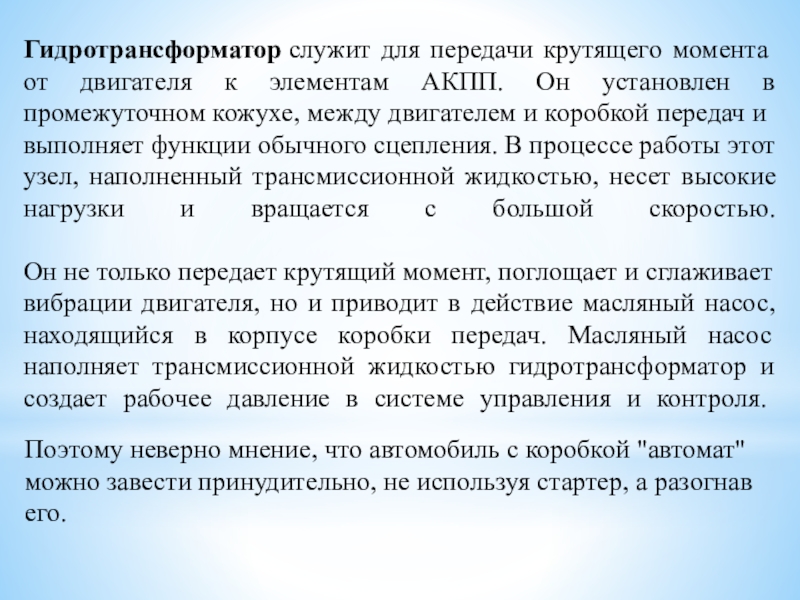 Слайд 6Гидротрансформатор служит для передачи крутящего момента от двигателя к элементам АКПП. Он
