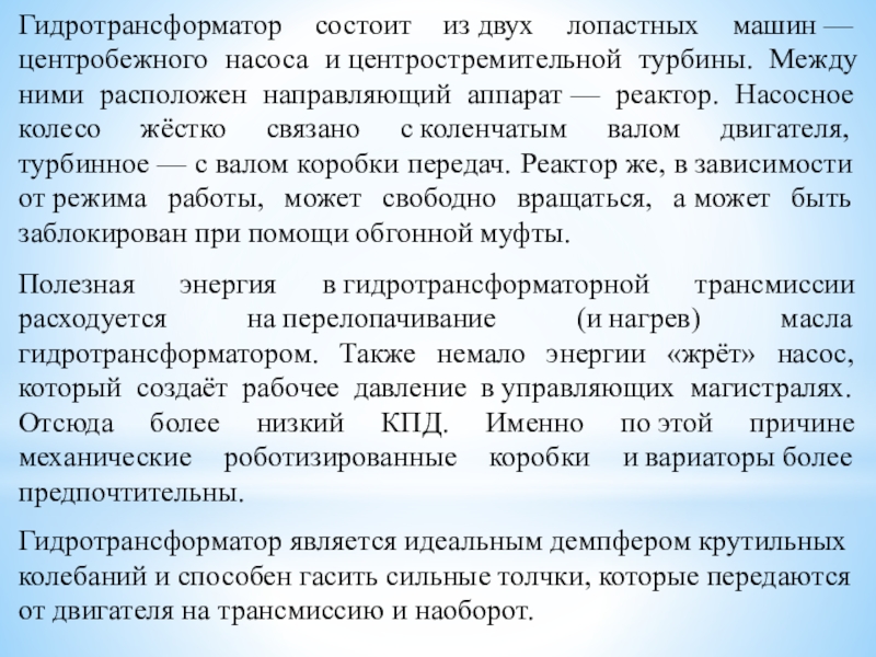 Слайд 10Гидротрансформатор состоит из двух лопастных машин — центробежного насоса и центростремительной турбины. Между ними