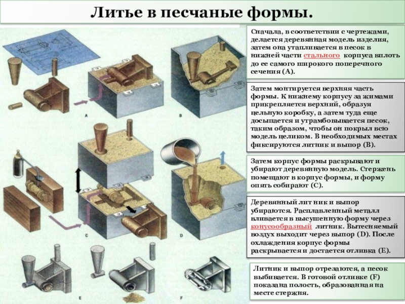 Литник и выпор отрезаются, а песок выбивается. В готовой отливке (F) показана полость, образованная на месте стержня.