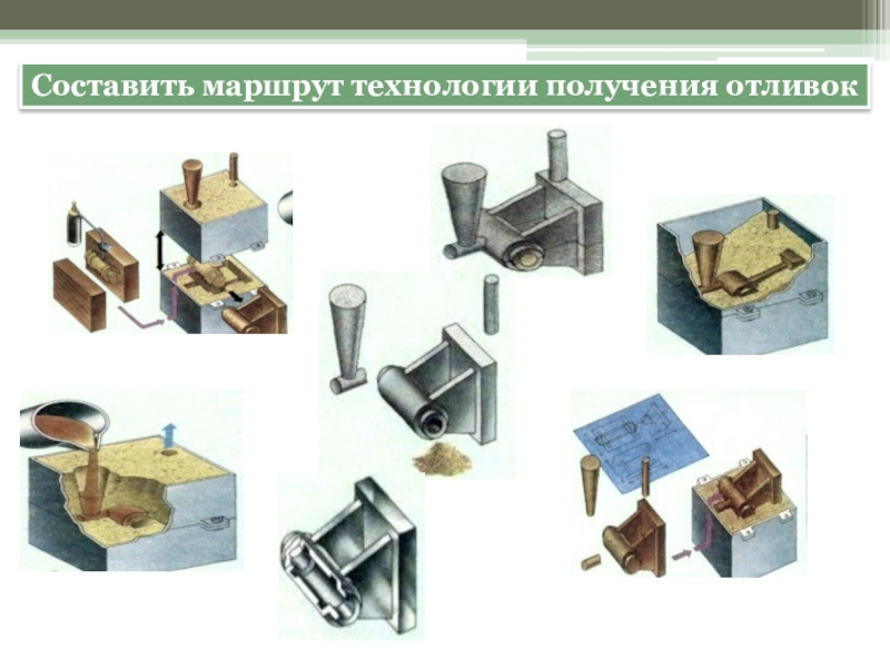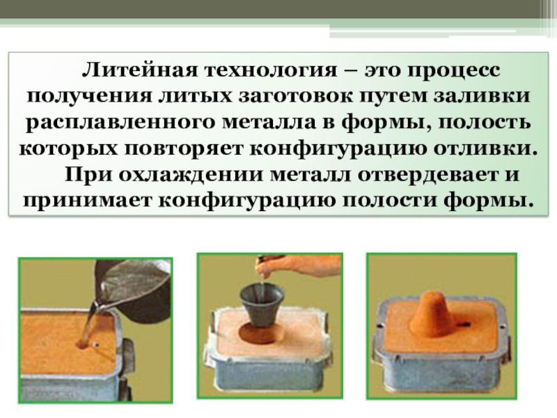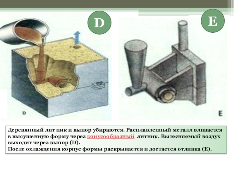Деревянный лит ник и выпор убираются. Расплавленный металл вливается в высушенную форму через конусообразный литник. Вытесняемый воздух выходит через выпор (D). После охлаждения корпус формы раскрывается и достается отливка (Е).