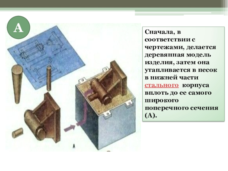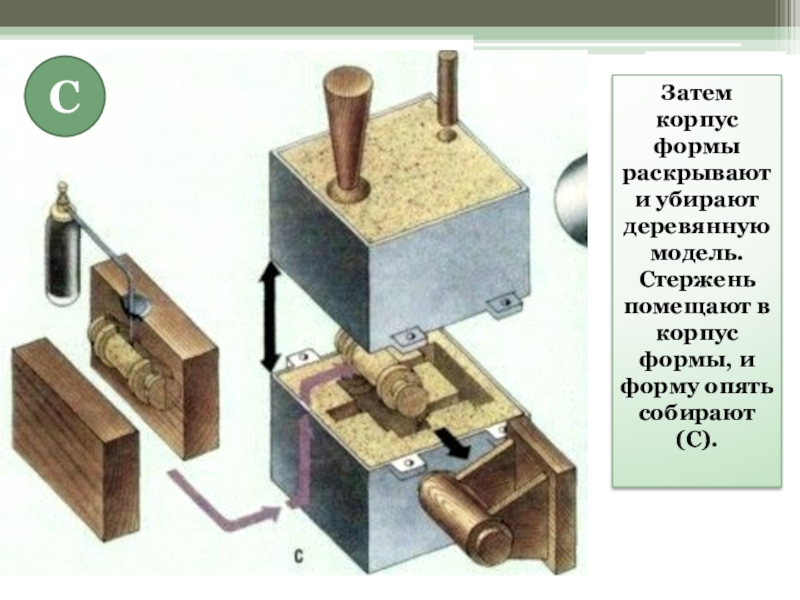 Затем корпус формы раскрывают и убирают деревянную модель. Стержень помещают в корпус формы, и форму опять собирают (С).
