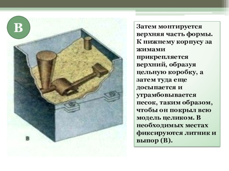 Затем монтируется верхняя часть формы. К нижнему корпусу за жимами прикрепляется верхний, образуя цельную коробку, а затем туда еще досыпается и утрамбовывается песок, таким образом, чтобы он покрыл всю модель целиком. В необходимых местах фиксируются литник и выпор (В).