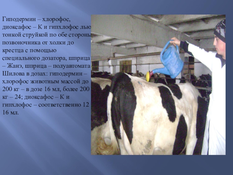 струйкой по обе стороны позвоночника от холки до крестца с помощью специального дозатора, шприца – Жанэ, шприца – полуавтомата Шилова в дозах: гиподермин – хлорофос животным массой до 200 кг – в дозе 16 мл, более 200 кг – 24; диоксафос – К и гипхлофос – соответственно 12 и 16 мл.