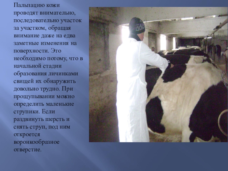 на едва заметные изменения на поверхности. Это необходимо потому, что в начальной стадии образования личинками свищей их обнаружить довольно трудно. При прощупывании можно определить маленькие струпики. Если раздвинуть шерсть и снять струп, под ним откроется воронкообразное отверстие.