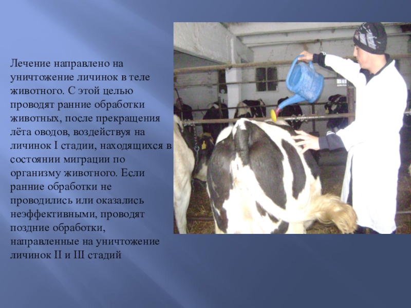 проводят ранние обработки животных, после прекращения лёта оводов, воздействуя на личинок I стадии, находящихся в состоянии миграции по организму животного. Если ранние обработки не проводились или оказались неэффективными, проводят поздние обработки, направленные на уничтожение личинок II и III стадий