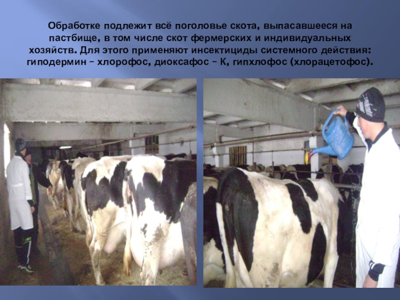скот фермерских и индивидуальных хозяйств. Для этого применяют инсектициды системного действия: гиподермин – хлорофос, диоксафос – К, гипхлофос (хлорацетофос).