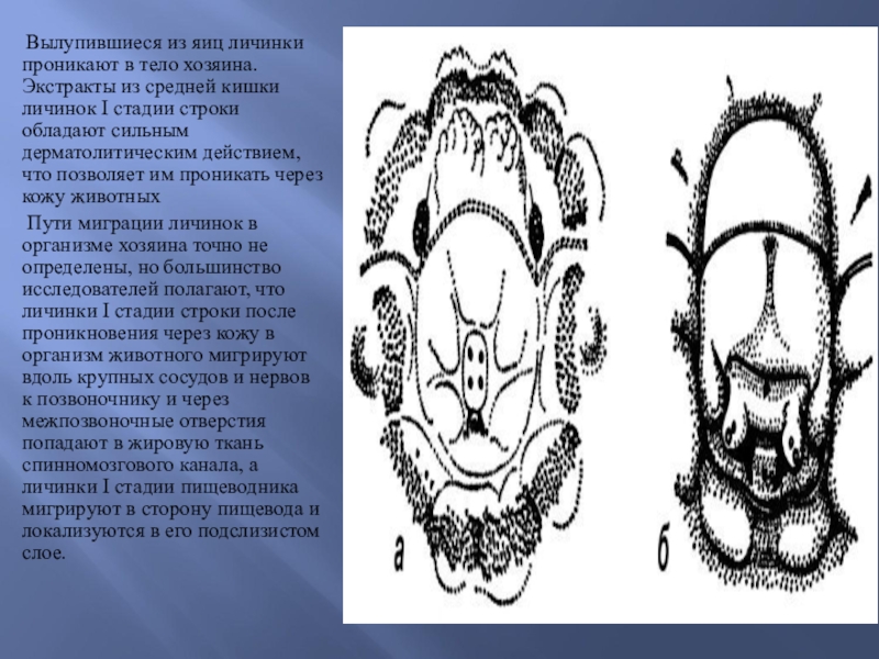 средней кишки личинок I стадии строки обладают сильным дерматолитическим действием, что позволяет им проникать через кожу животных
