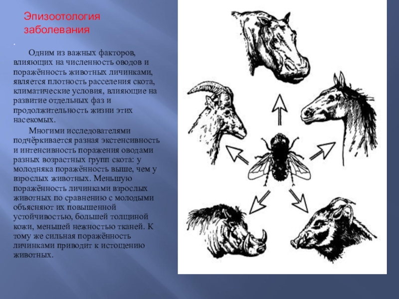 численность оводов и поражённость животных личинками, является плотность расселения скота, климатические условия, влияющие на развитие отдельных фаз и продолжительность жизни этих насекомых.
