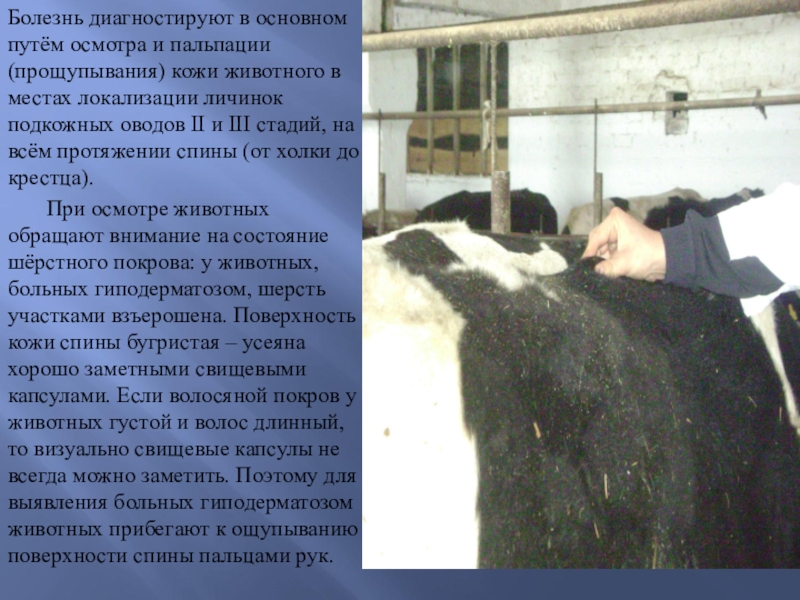 При осмотре животных обращают внимание на состояние шёрстного покрова: у животных, больных гиподерматозом, шерсть участками взъерошена. Поверхность кожи спины бугристая – усеяна хорошо заметными свищевыми капсулами. Если волосяной покров у животных густой и волос длинный, то визуально свищевые капсулы не всегда можно заметить. Поэтому для выявления больных гиподерматозом животных прибегают к ощупыванию поверхности спины пальцами рук.