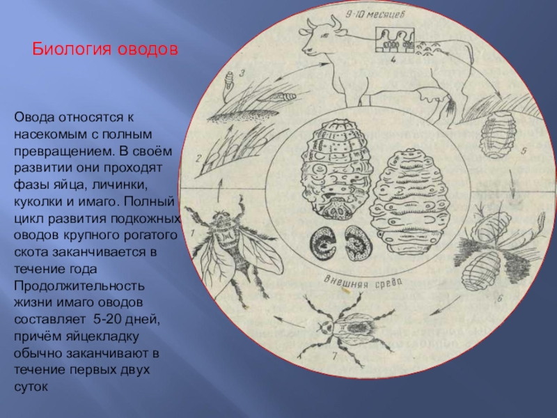 проходят фазы яйца, личинки, куколки и имаго. Полный цикл развития подкожных оводов крупного рогатого скота заканчивается в течение года Продолжительность жизни имаго оводов составляет 5-20 дней, причём яйцекладку обычно заканчивают в течение первых двух суток