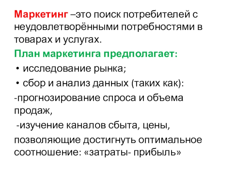 Слайд 6Маркетинг –это поиск потребителей с неудовлетворёнными потребностями в товарах и услугах.