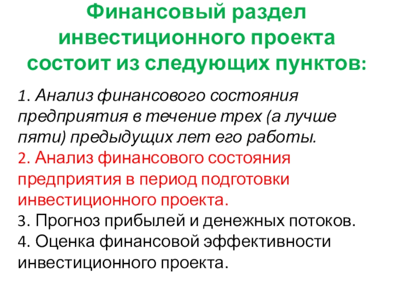 Слайд 25Финансовый раздел инвестиционного проекта состоит из следующих пунктов: