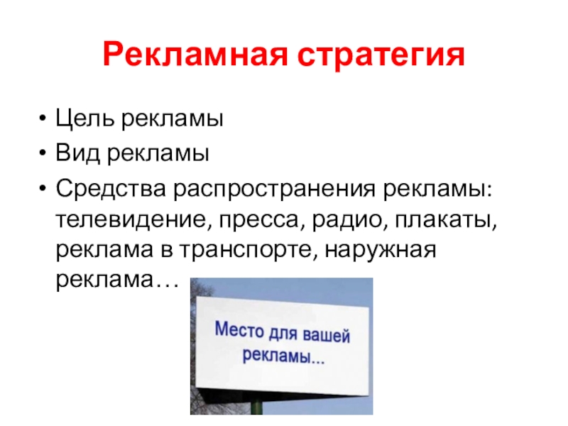 Средства распространения рекламы: телевидение, пресса, радио, плакаты, реклама