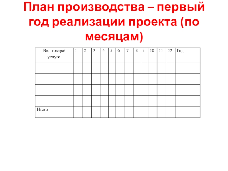 Слайд 17План производства – первый год реализации проекта (по месяцам)