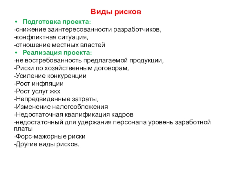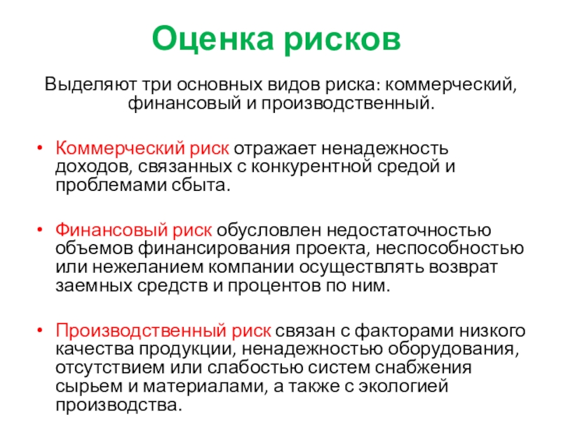 Выделяют три основных видов риска: коммерческий, финансовый и производственный.