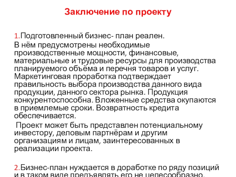 2.Бизнес-план нуждается в доработке по ряду позиций и в таком виде предъявлять его не целесообразно.